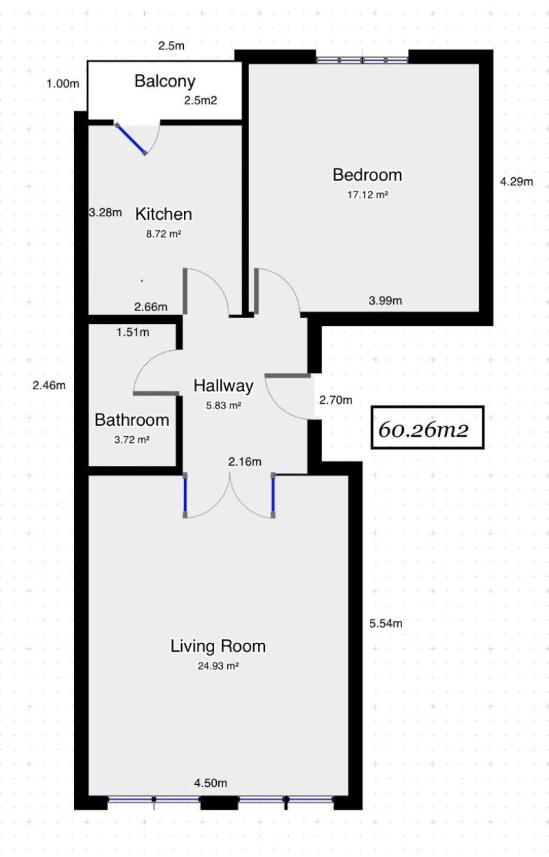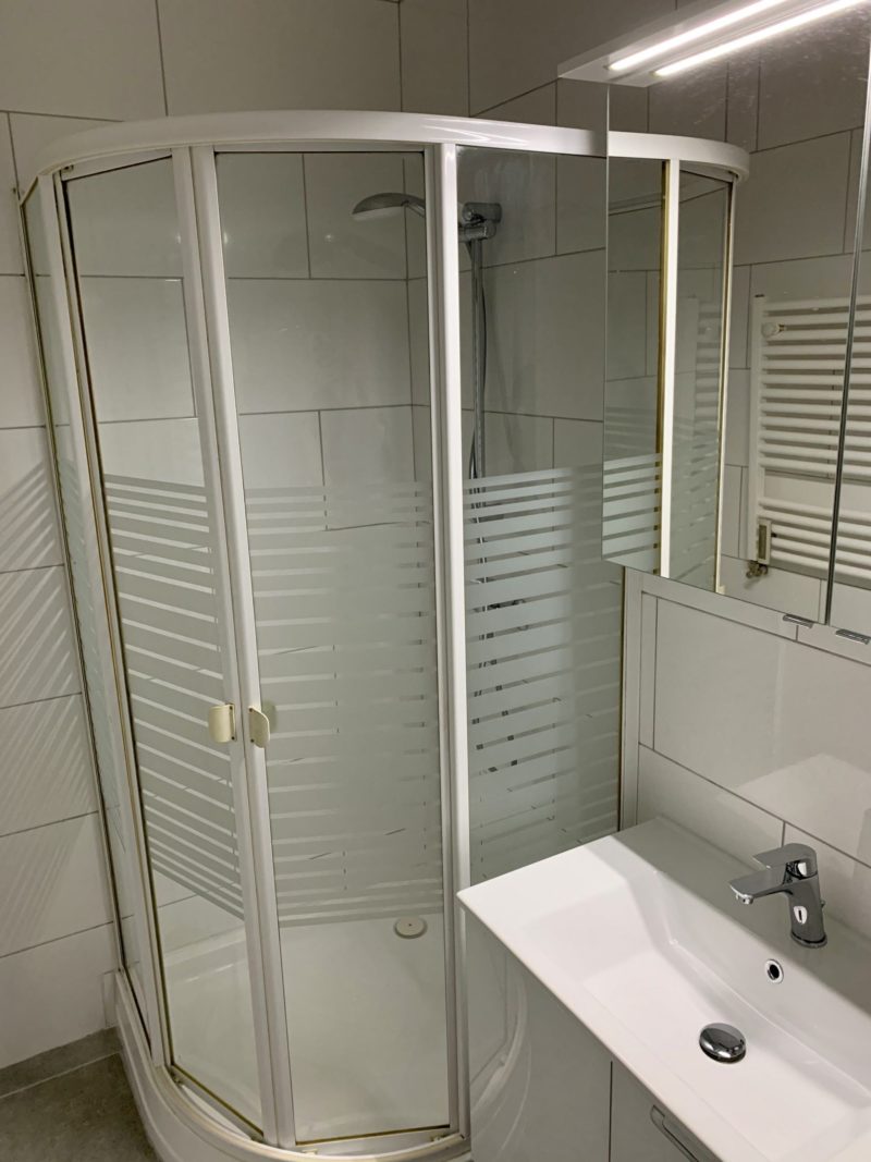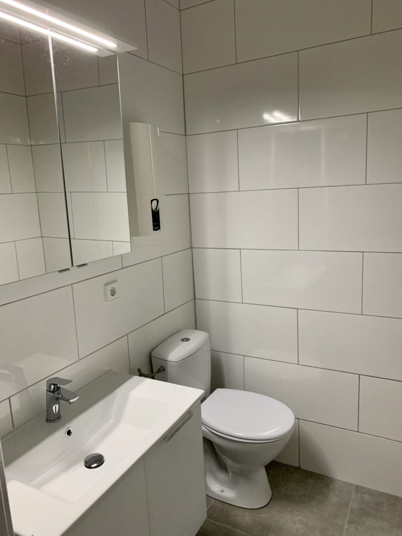 Description du bien : Hall d’entrée – living (+/- 25 m²) – cuisine équipée avec accès au balcon – 1 chambre à coucher – salle de douche.